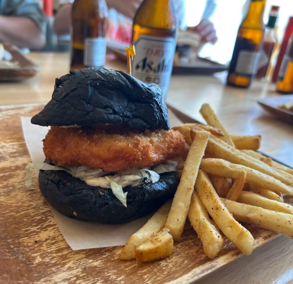 イカスミを練り込んだと思われる黒いバンズに、揚げたてのシーフードパティ。