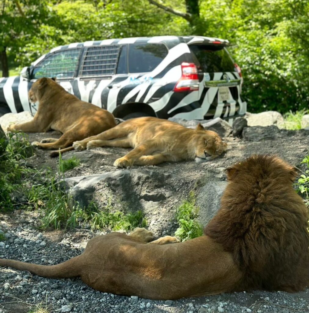 窓越しに見るライオンの迫力、のんびり草を食むキリンの姿、道路を横切るクマの姿…。