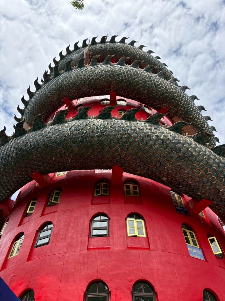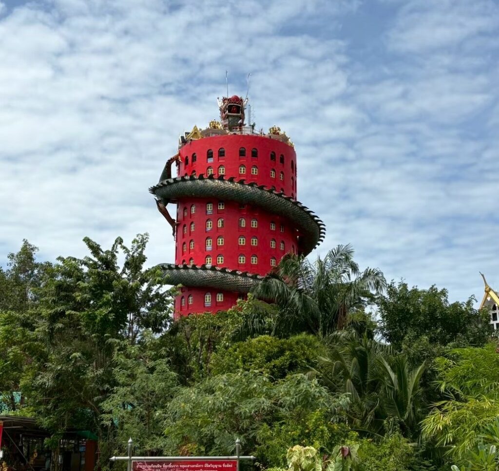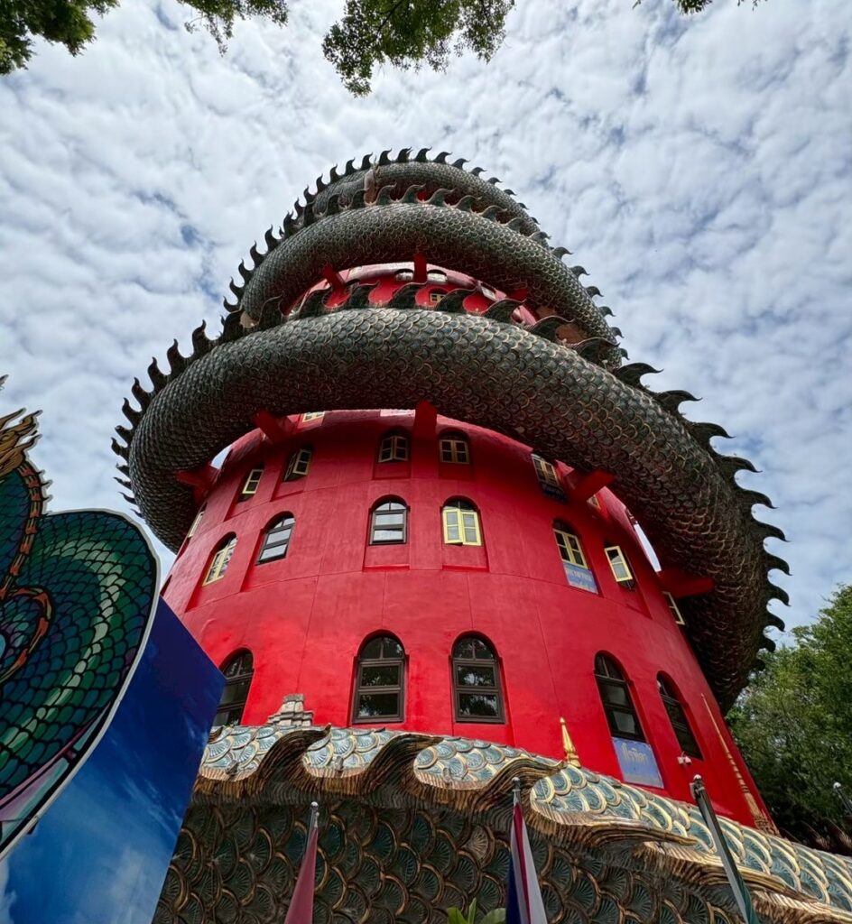 SNSで話題の赤色の巨大な塔に、緑色のドラゴンが螺旋状に巻き付いているインパクト抜群の寺院です。